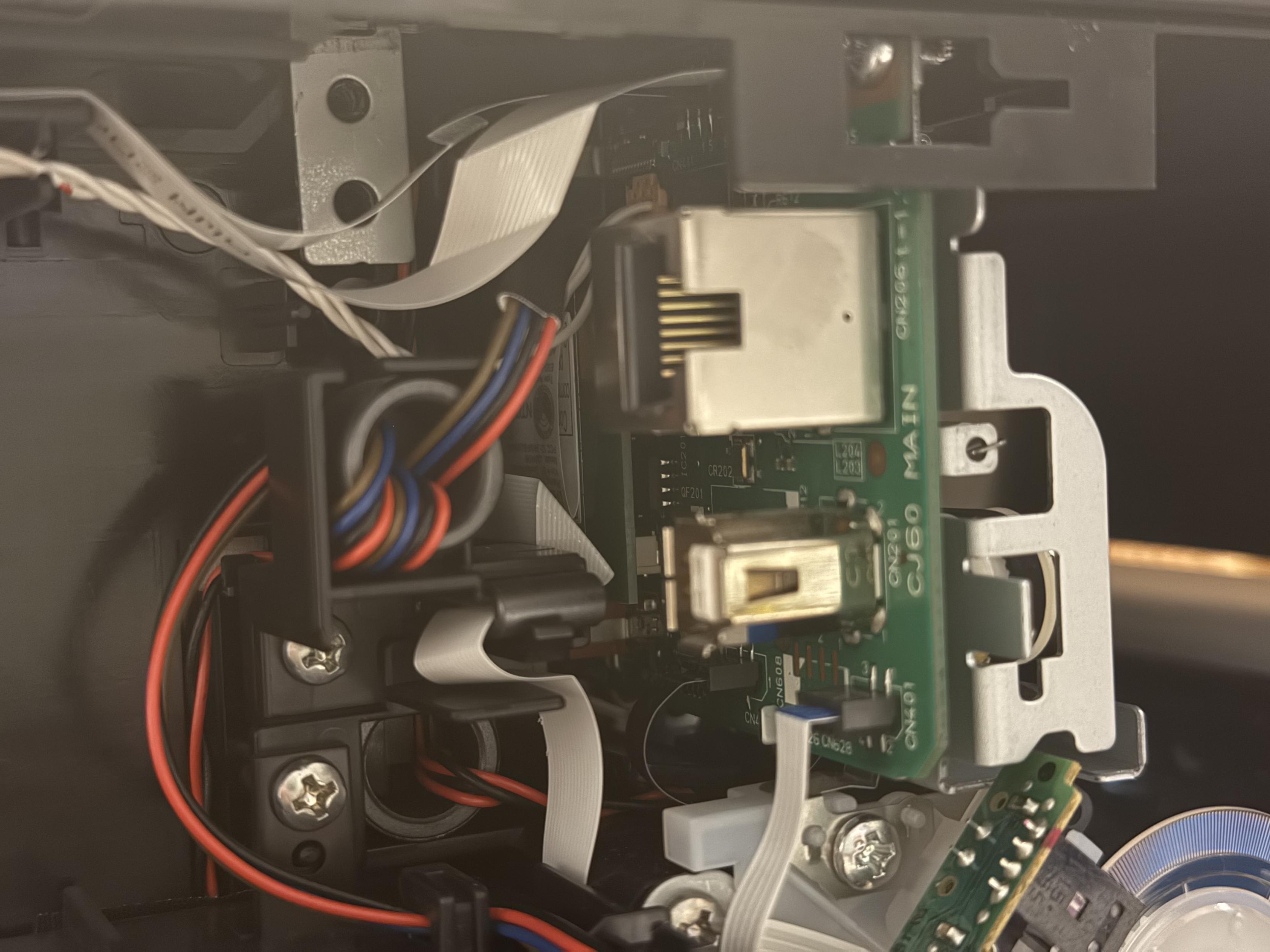 But if the module is replaceable, that means it’s socketed. Right? Well looking at the module in question (or at least one suggested to be compatible, I have not verified this) reveals that it uses a very dubious, non-latching (it has some clips but those hardly count) connector as the sole means for securing the WiFi card. As you might guess, this poor choice of connector coupled with the frequent vibrations associated with- y’know- slinging print heads around eventually shakes the module loose. This is not especially visible, but upon removing the cover on the USB/Ethernet/Power side of the printer, and (not so carefully) poking the WiFi module with a screwdriver my wireless woes were mysteriously fixed. If you’re having trouble and you plan to repeat this process, you need remove only three screws (two in the bottom and one in the top) and slide off the left-hand (from the front of the printer) cover to get very limited access to the mainboard. Use a plastic pry tool or other long, flat plastic tool to gently push the WiFi module back into place and cross your fingers.
